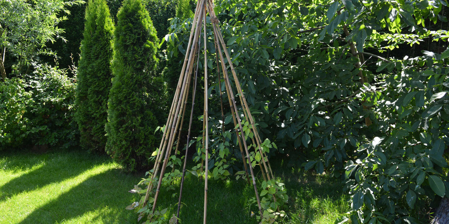 Die Bambusstäbe werden leicht schräg im gleichen Abstand zu einem festgelegten Mittelpunkt gesetzt, sodass ein gleichmäßiger Kreis entsteht. Oben werden die Stäbe dann einfach zusammengebunden. Die Bohnen werden nun an den Fuß der Stangen gepflanzt. Ich setze immer 2-3 Bohnenpflanzen pro Bambusstab.